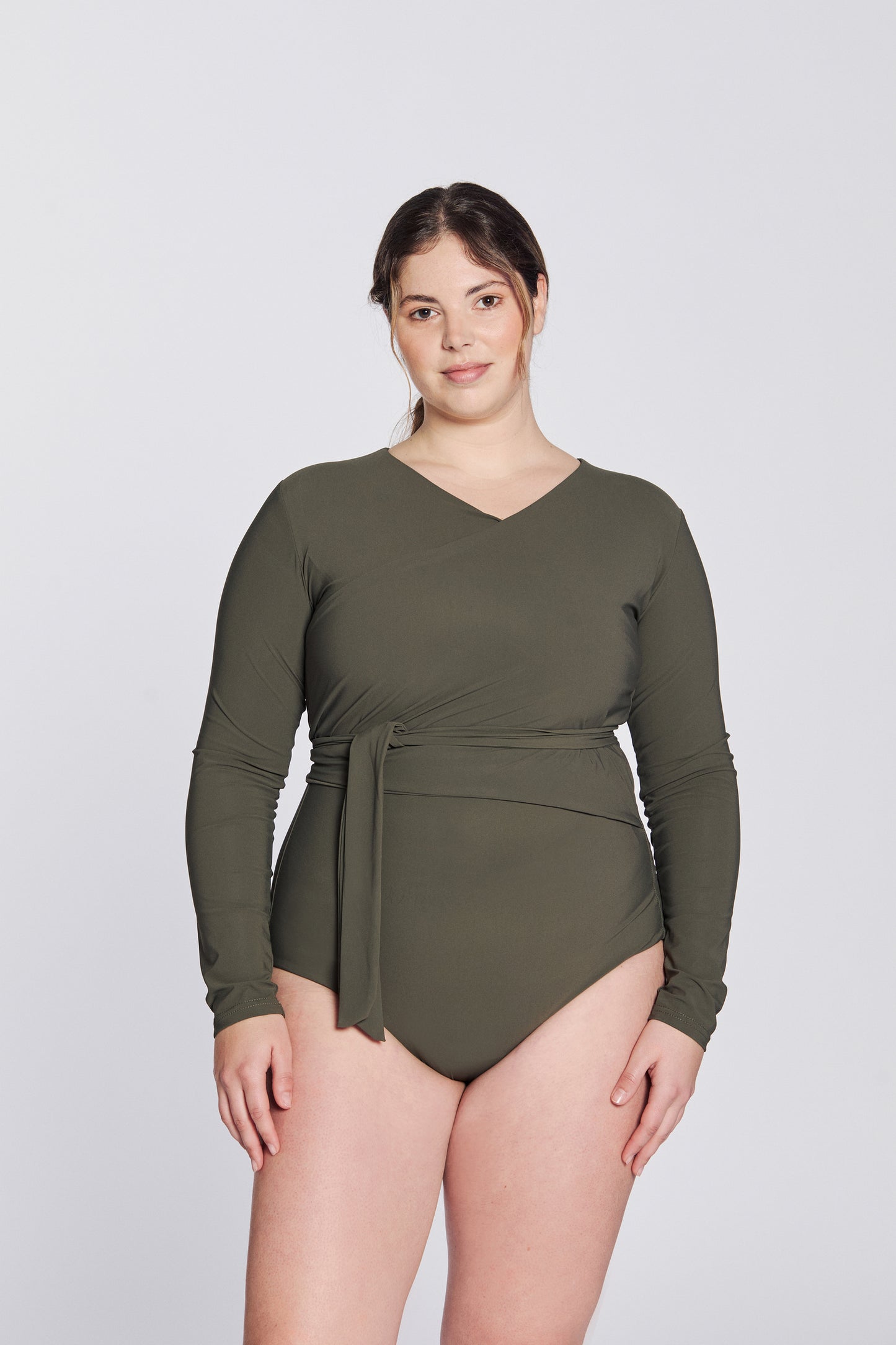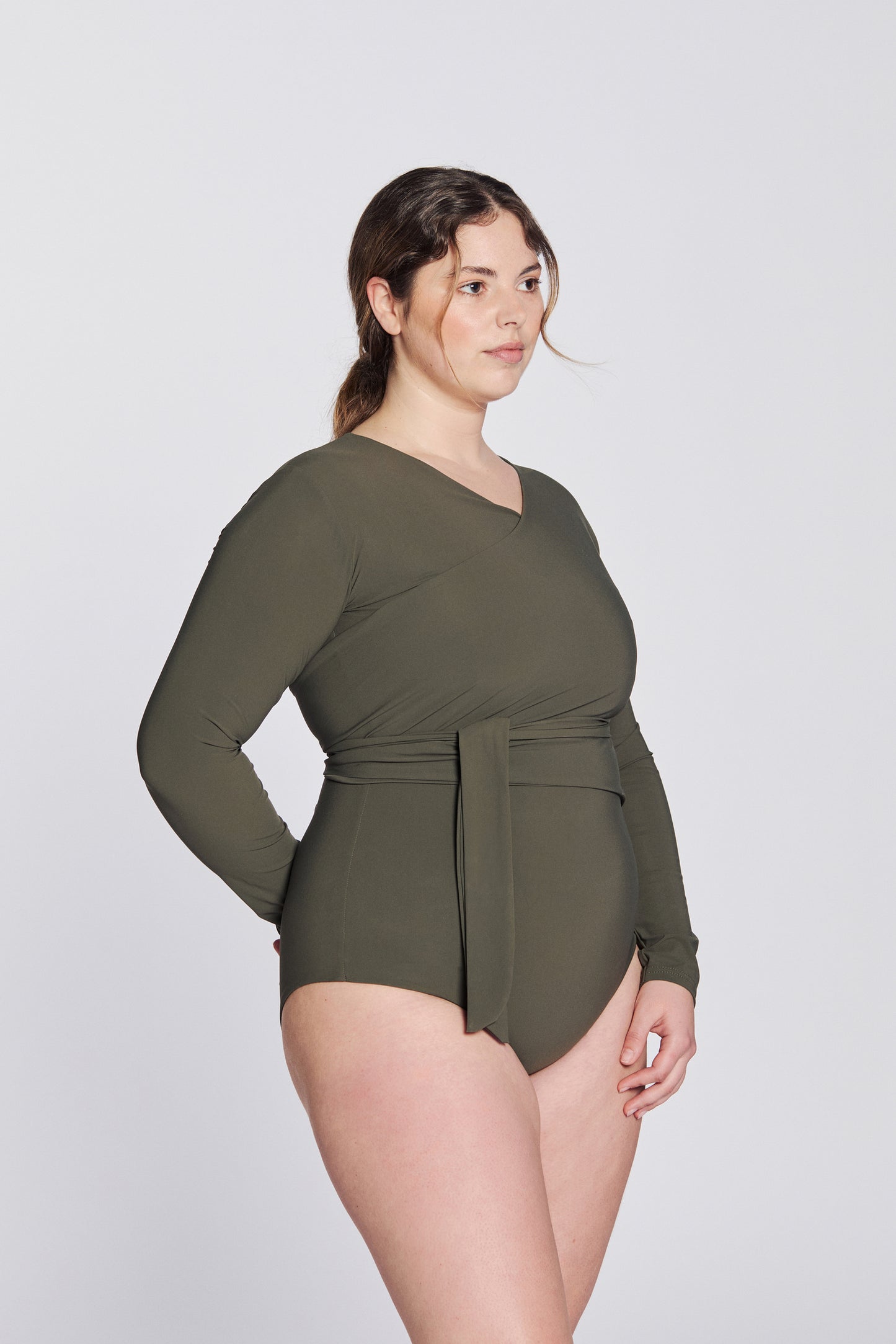 Meet the Aurora – our elegant UPF50+ UV-protective swimsuit inspired by the grace of the ancient Roman goddess. Designed with a romantic wrap silhouette, this long-sleeve swimsuit offers both sun protection and a flattering, adjustable fit for all body types. The two wrap panels tie at the side, allowing you to customize how snug or relaxed you want it to feel.