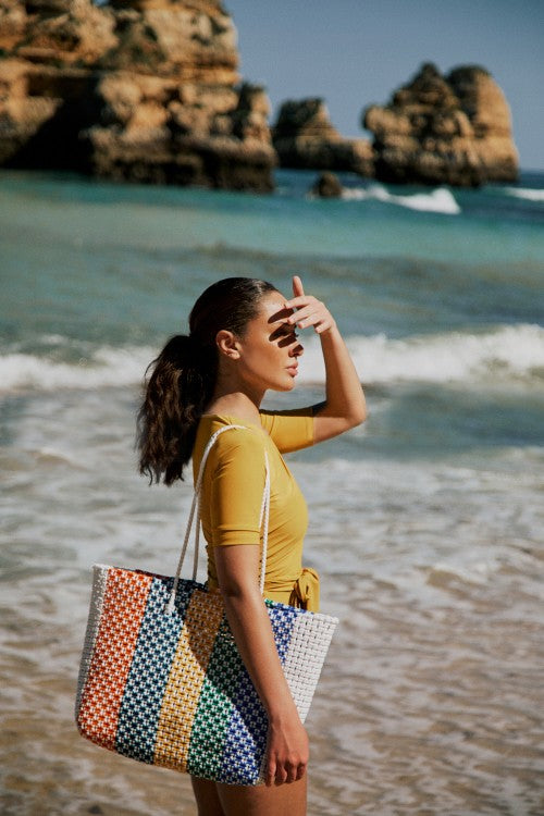 The Mira bag is your ultimate beach companion! Handwoven in Southern India from recycled plastic wires, this traditional Koodai bag is completely maintenance-free. Water-resistant and sand-proof - just shake, and the sand falls right through! Stylish, sturdy, and effortless - perfect for your next beach adventure and a colorful match with our swimwear.