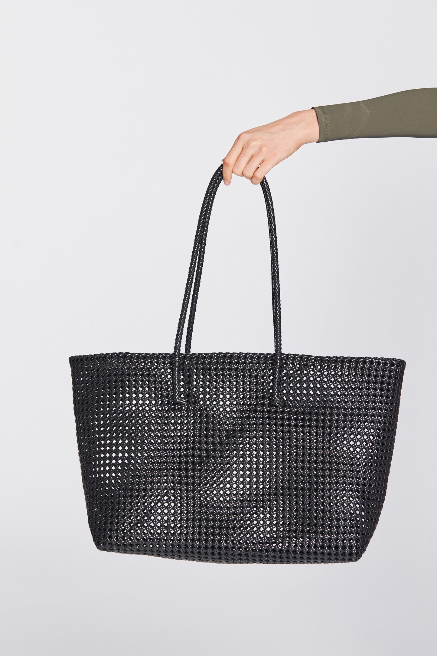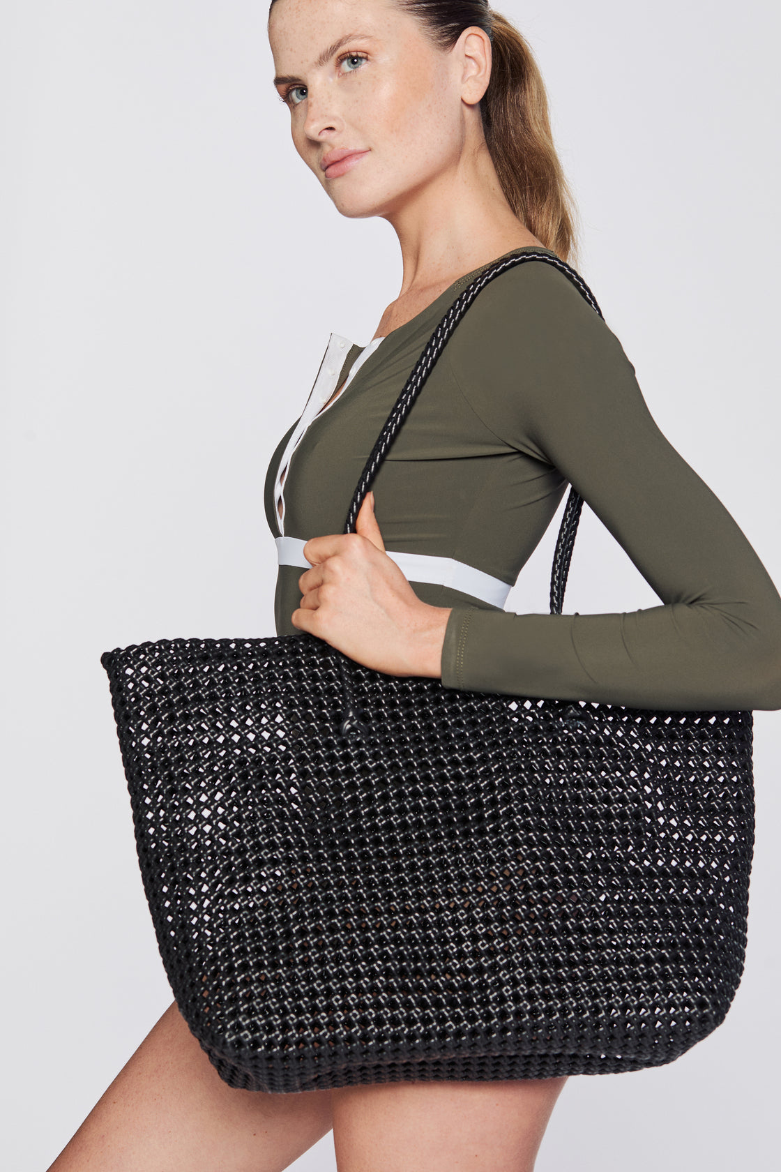 Timeless, elegant, and versatile – the Riva beach bag transitions effortlessly from beach to city to even office. Handwoven in Southern India from recycled plastic wires, this traditional Koodai bag is completely maintenance-free. Water-resistant and sand-proof – just shake, and the sand falls right through!